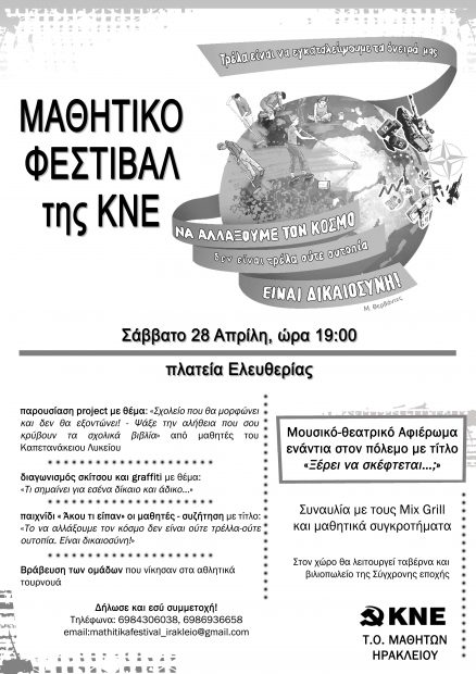 Για ακόμα μία χρονιά οι μαθητές της Κρήτης δίνουν ραντεβού στα Μαθητικά Φεστιβάλ της ΚΝΕ που θα περάσουν από όλους τους Νομούς,τις μεγάλες πόλεις αλλά και τα χωριά του νησιού. Φέτος τα μαθητικά Φεστιβάλ της ΚΝΕ έχουν σύνθημα : « Τρέλα είναι να εγκαταλείψουμε τα όνειρά μας.Να αλλάξουμε τον κόσμο,δεν είναι τρέλα,ούτε ουτοπία. Είναι δικαιοσύνη!» (Μ.Θερβάντες)