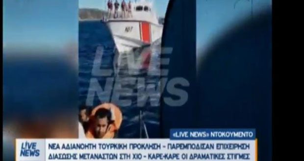 Συγκλονιστικές είναι οι αποκλειστικές εικόνες που προβλήθηκαν στην εκπομπή «Live News» του Νίκου Ευαγγελάτου στο Epsilon, από την παρενόχληση σκάφους του λιμενικού από σκάφος της τουρκικής ακτοφυλακής, τη στιγμή διάσωσης 53 μεταναστών το μεσημέρι της Μεγάλης Τετάρτης (04.04.2018), ανοιχτά της Χίου.