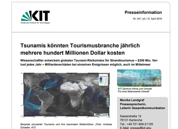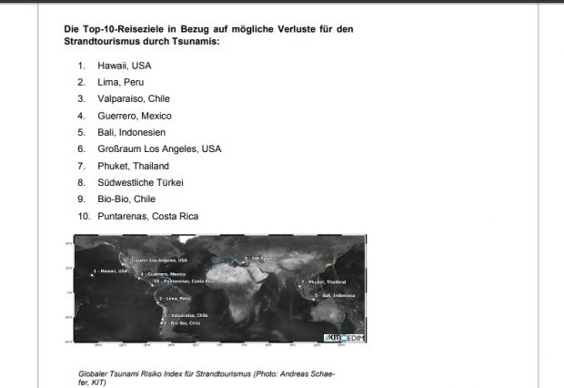 Ο Ανδρέας Σάφερ από το Τεχνολογικό Ινστιτούτο της Καρλσρούης, επικεφαλής της ομάδας μελέτης, σημείωσε ότι στο πλαίσιό της οι επιστήμονες εξέτασαν όλους τους σημαντικούς προορισμούς σε όλο τον κόσμο από την άποψη των πιθανών ζημιών για την τουριστική βιομηχανία, ως αποτέλεσμα των τσουνάμι.