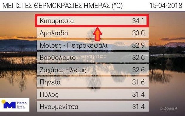 Κι όμως αυτή δεν ήταν η υψηλότερο θερμοκρασία στην Ελλάδα, καθώς στην Κυπαρισσία το θερμόμετρο ξεπέρασε τους 34 βαθμούς και στην Αμαλιάδα έφτασε τους 33!