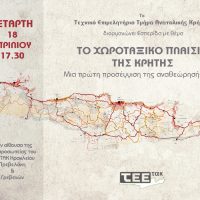 Το Τεχνικό Επιμελητήριο Ελλάδας/Τμήμα Ανατολικής Κρήτης διοργανώνει εσπερίδα με θέμα: “ΤΟ ΧΩΡΟΤΑΞΙΚΟ ΠΛΑΙΣΙΟ ΤΗΣ ΚΡΗΤΗΣ – Μια πρώτη προσέγγιση της αναθεώρησής του”. Η Εσπερίδα θα πραγματοποιηθεί την Τετάρτη 18 Απριλίου 5:30 μ.μ., στην αίθουσα της Αντιπροσωπείας του ΤΕΕ/ΤΑΚ στην οδό Πρεβελάκη & Γρεβενών.