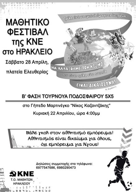 Ο Μαθητικός Τομέας Ηρακλείου της ΚΝΕ την Κυριακή 22/4,οργανώνει την β΄φάση του τουρνουά ποδοσφαίρου 5Χ5 στο γήπεδο Μαρτινέγκο, «Νίκος Καζατζάκης»,ώρα έναρξης 4μ.μ,με τίτλο: «Βάλε γκόλ στον αθλητισμό-εμπόρευμα.Ο αθλητισμός είναι δικαίωμα για όλους,όχι εμπόρευμα για λίγους».Το τουρνουά έρχεται σαν συνέχεια της πρώτης φάσης που ολοκληρώθηκε το Σάββατο 31/3 στο γηπεδάκι των Δειλινών.