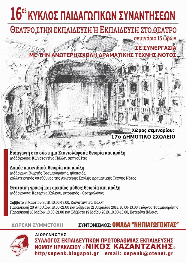 Ο Σύλλογος Εκπαιδευτικών Πρωτοβάθμιας Εκπαίδευσης Νομού Ηρακλείου ‘’ Νίκος Καζαντζάκης ΄΄ σε συνεργασία με την Ανώτερη Σχολή Θεάτρου Νότος και τον συντονισμό της ομάδας «Νηπιαγωγώντας» του Συλλόγου μας συνεχίζουν την υλοποίηση του 16ου Κύκλου Παιδαγωγικών Συναντήσεων με θέμα «Θέατρο στην εκπαίδευση ή Εκπαίδευση στο θέατρο».