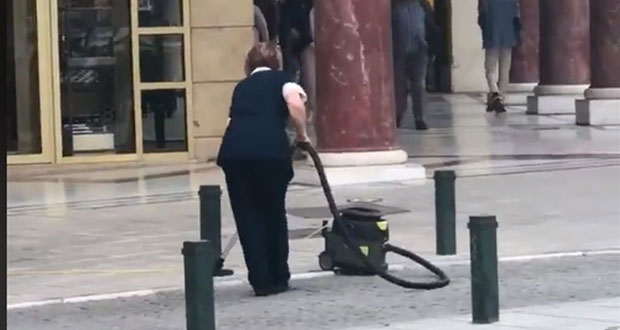 Όπως φαίνεται στο σχετικό video, η εν λόγω γυναίκα, πιθανότατα εργαζόμενη επιχείρησης, έβαλε κανονικά ηλεκτρική σκούπα στο «πέταλο» της πλατείας Αριστοτέλους, στην συμβολή της με την οδό Μητροπόλεως…