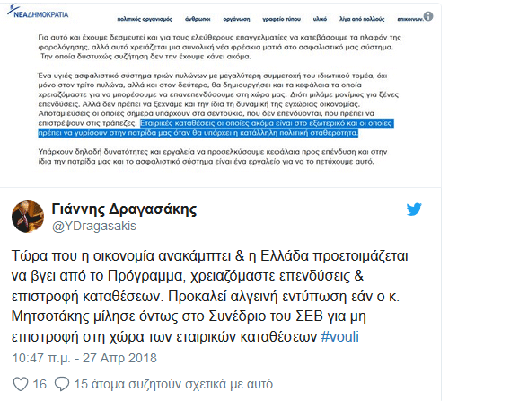 Ωστόσο, λίγο αργότερα σε ανάρτηση του στο Twitter, o Γιάννης Δραγασάκης, δημοσίευσε το επίμαχο απόσπασμα από την ομιλία του Κυριάκου Μητσοτάκη στον ΣΕΒ, όπως αυτό δημοσιεύεται στην επίσημη ιστοσελίδα της ΝΔ.