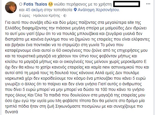 “Για αυτό που συνέβη εδώ και δύο μέρες παίζοντας στα μεγαλύτερα site της Ελλάδος διαφημίζοντας την πιάσανε μεγάλη σπείρα με μαϊμούδες Δεν ιδρώνει το αυτί μου γιατί ξέρω ότι το να πουλάς μπλουζάκια και ζευγάρια γυαλιά δεν διαπράττει με κανένα έγκλημα που να ζημιώνει τις εταιρείες που είναι ελέφαντες και βρήκαν ένα ποντικάκι να το στριμώξει στη γωνία Το μόνο που καταφέρνουμε είναι αυτοί οι 60 οικογένειες που ζούνε από τις επιχειρήσεις μου και τα τουριστικά μαγαζιά να χάσουν τον ύπνο τους φοβόνταν μήπως και κλείσω τα μαγαζιά μήπως και οι οικογένειές τους μείνουν χωρίς μεροκάματο Ε όχι δεν θα κάνω το χατίρι κανενός εταιρείας και καμία new αστυνομικού που και αυτοί από τη μεριά τους τη δουλειά τους κάνουνε Αλλά εμείς Δεν πουλάμε ναρκωτικά χέρι δεν κοροϊδεύουμε τον κόσμο ένα μπλουζάκι που κάνει 5 ευρώ γνωρίζει ο άλλος ότι το παίρνει και δεν είναι γνήσιο Γιατί αυτός ο άνθρωπος που δίνει 5 ευρώ μπορεί να μην μπορεί να δώσει τα 100 που κάνει το γνήσιο προς όλους Και Όλα Τα παιδιά που δουλεύουν στα μαγαζιά της εταιρείας μου όσο έχω εγώ την υγεία μου Μη φοβάστε τίποτα δεν θα μείνετε στο δρόμο μία τριπλό πόδια ήταν στη ζωή Σηκωνόμαστε πεισμώνω με και συνεχίζουμε πιο δυνατά”.