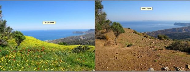 Είναι από το ίδιο σημείο στην περιοχή της Σητείας και έχουν ληφθεί με διαφορά ενός έτους, όπως αναφέρει ο Ιωσήφ Καμπανάκης που ανάρτησε την εικόνα στους Μετεωκρήτες. Αριστερά, όπως ήταν η περιοχή στις 26 Απριλίου 2017, μετά από ένα χειμώνα με έντονες βροχοπτώσεις. Δεξιά, όπως ήταν χθες, μετά από τη φετινή ανομβρία…
