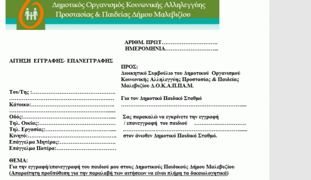 Από την Τετάρτη 2 Μαΐου ξεκινάει η διαδικασία υποβολής αιτήσεων για εγγραφή και επανεγγραφή των παιδιών στους Παιδικούς Σταθμούς που υπάγονται στο Δημοτικό Οργανισμό Κοινωνικής Αλληλεγγύης Προστασίας Παιδείας Μαλεβιζίου (Δ.Ο.Κ.Α.Π.ΠΑ.Μ) Δ. Μαλεβιζίου.