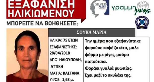 Από την πρώτη στιγμή της εξαφάνισής της, είχε εκδοθεί Silver Alert. Η άτυχη Μαρία Σούκα έπασχε από βαριάς μορφής Αλτσχάιμερ. Είχε φύγει από το σπίτι της στην Ηλιούπολη μαζί με τον σκύλο της, ο οποίος βρέθηκε στο πλευρό της.