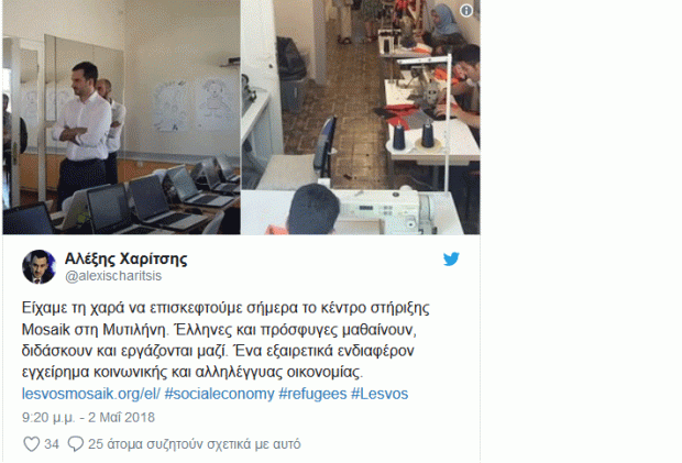 Για εξαιρετικά ενδιαφέρον εγχείρημα κοινωνικής και αλληλέγγυας οικονομίας κάνει λόγο στο Twitter o αναπληρωτής υπουργός Οικονομίας και Ανάπτυξης, Αλέξης Χαρίτσης, αναφερόμενος στο Κέντρο Στήριξης προσφύγων και ντόπιων, Mosaik, το οποίο επισκέφθηκε την Τετάρτη 2 Μαΐου 2018, στη Μυτιλήνη, στο περιθώριο του 14ου Περιφερειακού Αναπτυξιακού Συνεδρίου για το Βόρειο Αιγαίο.