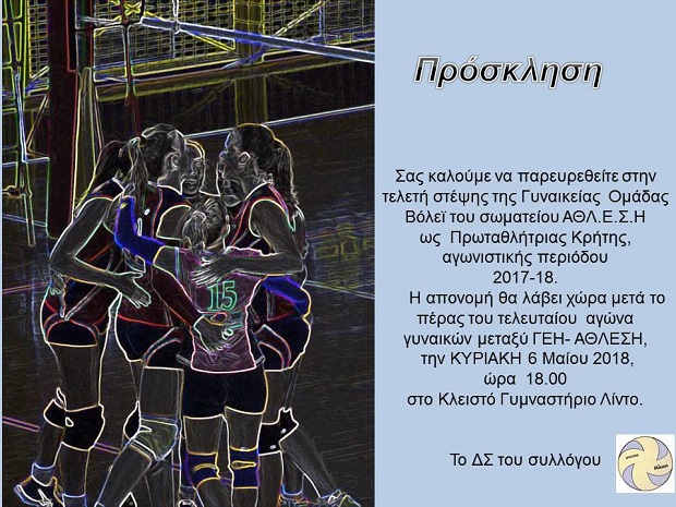 Το πρωτάθλημα γυναικών βόλεϊ Κρήτης τελειώνει την Κυριακή , ο αγώνας ΓΕΗ- ΑΘΛΕΣΗ, δεν έχει σημασία γιατί η πρωταθλήτρια έχει ήδη στεφθεί, πριν αυτό τελειώσει. Η πρόσκληση έχει τη σημασία να βρεθούμε όλοι μαζί στο γήπεδο και να χαρούμε το τέλος της φετινής πορείας των 2 πρωτοπόρων γυναικείων ομάδων της Κρήτης Τα κορίτσια και των 2 ομάδων πασχίζουν για το καλύτερο και το κυριότερο όλων είναι το καλό κλίμα μεταξύ τους. Το Ηράκλειο μπορεί να επαίρεται πως στα τελευταία χρόνια πρωταγωνιστεί στην Κρήτη στο άθλημα της πετοσφαίρισης.