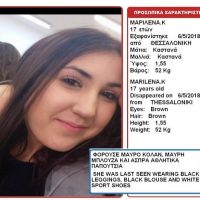 Στις 6 Μαΐου χάθηκαν τα ίχνη της 17χρονης Μαριλένας Κ. από την περιοχή της Πυλαίας Θεσσαλονίκης. Για την εξαφάνιση της ανήλικης ενημερώθηκε «Το χαμόγελο του παιδιού» σήμερα, 7 Μαΐου, το μεσημέρι και λίγες ώρες αργότερα, εκδόθηκε η σχετική ανακοίνωση. Η Μαριλένα Κ. έχει ύψος 1,55 μ., ζυγίζει 52 κ., έχει καστανά μακριά μαλλιά και καστανά μάτια. Φορούσε μαύρο κολάν, μαύρη…