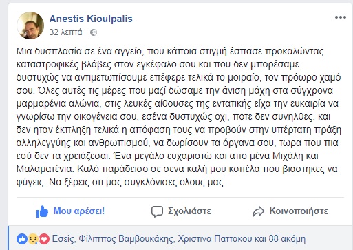 “Μια δυσπλασία σε ένα αγγείο, που κάποια στιγμή έσπασε προκαλώντας καταστροφικές βλάβες στον εγκέφαλο σου και που δεν μπορέσαμε δυστυχώς να αντιμετωπίσουμε επέφερε τελικά το μοιραίο, τον πρόωρο χαμό σου. Όλες αυτές τις μέρες που μαζί δώσαμε την άνιση μάχη στα σύγχρονα μαρμαρένια αλώνια, στις λευκές αίθουσες της εντατικής είχα την ευκαιρία να γνωρίσω την οικογένεια σου, εσένα δυστυχώς οχι, ποτε δεν συνηλθες, και δεν ηταν έκπληξη τελικά η απόφαση τους να προβούν στην υπέρτατη πράξη αλληλεγγύης και ανθρωπισμού, να δωρίσουν τα όργανα σου, τωρα που πια εσύ δεν τα χρειάζεσαι. Ένα μεγάλο ευχαριστώ και απο μένα Μιχάλη και Μαλαματένια. Καλό παράδεισο σε σενα καλή μου κοπέλα που βιαστηκες να φύγεις. Να ξέρεις οτι μας συγκλόνισες ολους μας”.