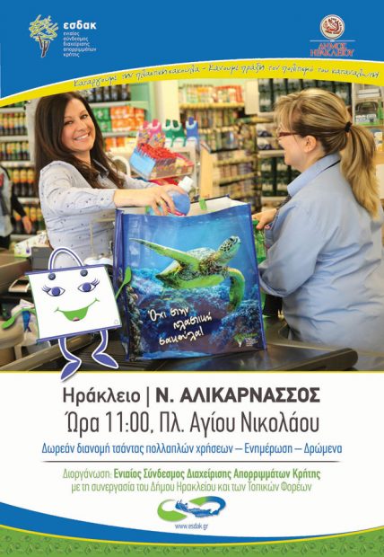 Συνεχίζονται οι δράσεις ενημέρωσης και δωρεάν διανομής της τσάντας πολλαπλών χρήσεων του Ενιαίου Συνδέσμου Διαχείρισης Απορριμμάτων Κρήτης (Ε.Σ.Δ.Α.Κ.) και σε συνεργασία με τον Δήμο Ηρακλείου και τους τοπικούς φορείς, διοργανώνεται ανοικτή εκδήλωση στην πλ. Αγίου Νικολάου στην Ν. Αλικαρνασσό, την Τρίτη 15 Μαΐου 2018, στις 11:00.