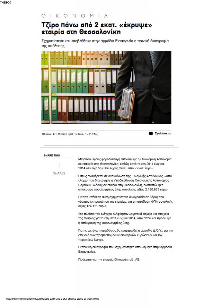 Σύμφωνα με το ρεπορτάζ του thetoc.gr, στην ανακοίνωση της Ελληνικής Αστυνομίας αναφερόταν ότι «από έλεγχο που διενέργησε η Υποδιεύθυνση Οικονομικής Αστυνομίας Βορείου Ελλάδας σε εταιρία στη Θεσσαλονίκη, διαπιστώθηκε απόκρυψη φορολογητέας ύλης συνολικής αξίας 2.120.925 ευρώ.