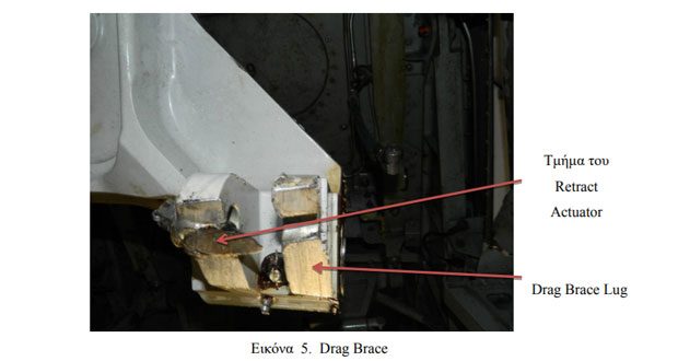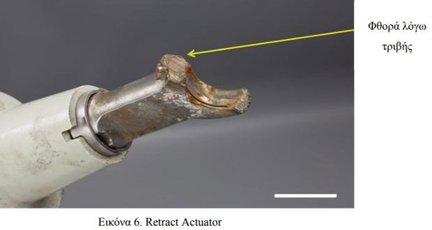 Το άκρο του ‘Retract Actuator’ (Εικ. 6), σημείο σύνδεσης με το ‘Drag Brace’ βρέθηκε φθαρμένο λόγω τριβής, με τον ίδιο τρόπο που είχε φθαρεί το εσωτερικό ωτίο του βραχίονα στήριξης (Drag Brace Lug).
