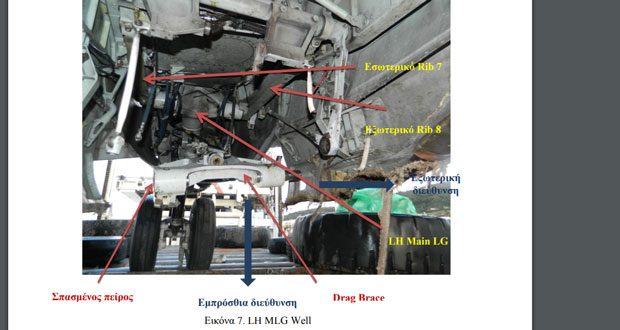Όταν ανασηκώθηκε η αριστερή πτέρυγα του α/φ, κατά τον οπτικό έλεγχο του αριστερού κυρίου σκέλους προσγείωσης διαπιστώθηκαν τα παρακάτω:
