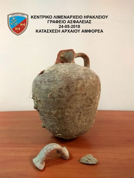 Όπως αναφέρει σε ανακοίνωσή του το λιμενικό, κατόπιν αξιοποίησης πληροφοριών σχετικά με κατοχή αρχαίων αντικειμένων από αλλοδαπό αλιεργάτη, ο οποίος προσπαθούσε να τα εμπορευθεί, διενεργήθηκε έρευνα στο αλιευτικό σκάφος «ΚΑΝΕΛΛΟΣ ΙΙ» Ν.Η. 111, το οποίο ήταν προσδεδεμένο στην προβλήτα VI λιμένα Ηρακλείου, κατά τη διάρκεια της οποίας βρέθηκαν και κατασχέθηκαν ένας αρχαίος αμφορέας με σπασμένο λαιμό και τη μία χειρολαβή του, ύψους 46 εκατοστών, μέγιστης διαμέτρου περίπου 33 εκατοστών και μέγιστης περιφέρειας περίπου 109 εκατοστών, χειρολαβή αρχαίου αμφορέα μήκους περίπου 14 εκατοστών, πλάτους περίπου 7,5 εκατοστών και τμήμα αμφορέα μέγιστου μήκους περίπου 6 εκατοστών και μέγιστου πλάτους περίπου 5 εκατοστών.