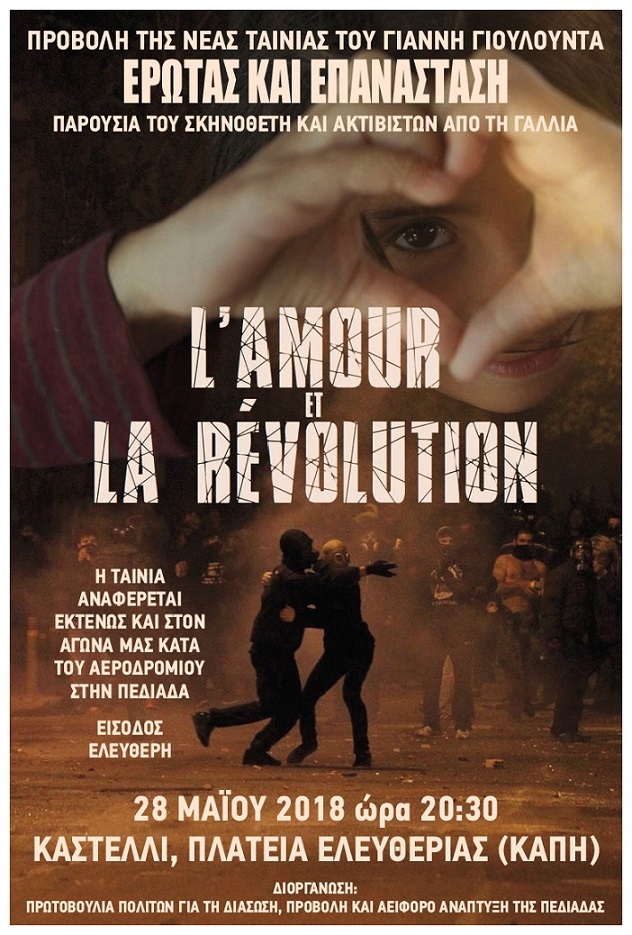 Την προβολή στο Καστέλλι της νέας ταινίας «ΕΡΩΤΑΣ ΚΑΙ ΕΠΑΝΑΣΤΑΣΗ» (L’ AMOUR ET LA REVOLUTION), ανακοίνωσε η Πρωτοβουλία Πολιτών για τη διάσωση, προβολή και αειφόρο ανάπτυξη της Πεδιάδας,. Η προβολή θα γίνει τη Δευτέρα 28 Μαΐου στις 8:30 μμ, στην πλατεία Ελευθερίας στο Καστέλλι, ενώ παράλληλα θα γίνει υποδοχή των αλληλέγγυων, στον αγώνα ακύρωσης του προωθούμενου αεροδρομίου, από την Notre-Dame-des-Landes της Γαλλίας.