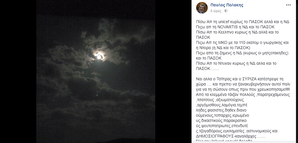 Με… ρομαντική (εκτός από πολιτική) διάθεση έγραψε για τα σκάνδαλα ΠΑΣΟΚ και ΝΔ χθες τη νύχτα ο αναπληρωτής υπουργός Υγείας, Παύλος Πολάκης. Από το σπίτι του στα Σφακιά, έβλεπε τον συννεφιασμένο ουρανό κι έγραψε: