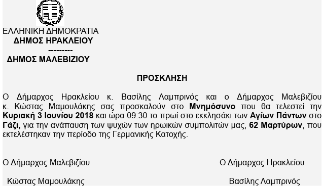 Την Κυριακή 3 Ιουνίου 2018 και ώρα 09:30 θα τελεστεί Αρχιερατικό Μνημόσυνο, στο εκκλησάκι των Αγίων Πάντων, στο Γάζι, για την ανάπαυση των ψυχών των 62 μαρτύρων που εκτελέστηκαν την περίοδο της Γερμανικής Κατοχής.