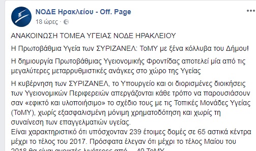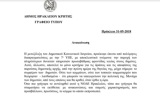 Δείτε την ανακοίνωση που εξέδωσε χθες ο τομέας Υγείας της ΝΟΔΕ Ηρακλείου και στη συνέχεια την απάντηση του δήμου