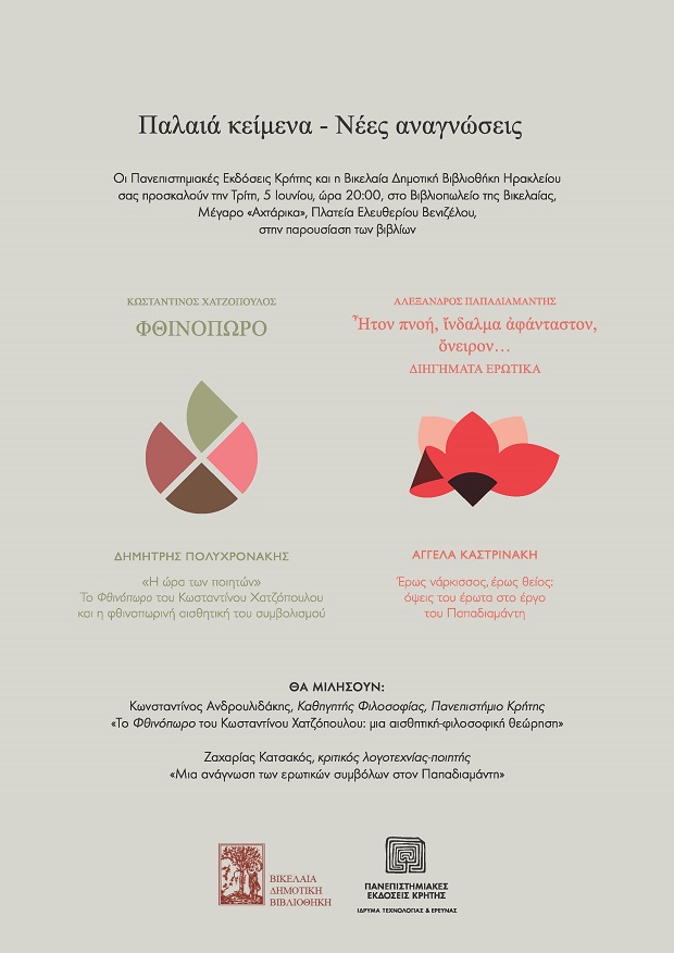 Δυο νέες εκδόσεις παρουσιάζουν την ερχόμενη Τρίτη οι Πανεπιστημιακές Εκδόσεις και η Βικελαία. Πρόκειται για προσέγγιση στα έργα των Κωνσταντίνου Χατζόπουλου, από τον Δημήτρη Πολυχρονάκη, και Αλέξανδρου Παπαδιαμάντη, από την Αγγέλα Καστρινάκη.