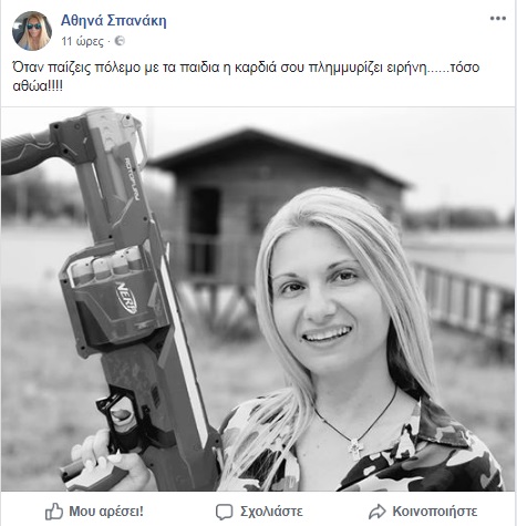 Λίγο μετά την ανάρτηση αυτή, η κ. Σπανάκη ανέβασε και μια φωτογραφία στην οποία εμφανίζεται η ίδια με… όπλο- παιγνίδι, δηλώνοντας ότι όταν παίζεις πόλεμο με τα παιδιά, η καρδιά σου πλημμυρίζει ειρήνη!
