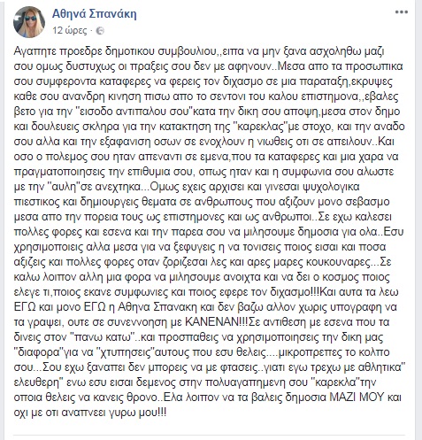 Η κ. Σπανάκη με ανάρτησή της στο facebook εξαπέλυσε χθες βράδυ μια σφοδρή επίθεση στον Γρηγόρη Πασπάτη, στον οποίο αναφέρεται απαξιωτικά, τον κατηγορεί ότι επιτίθεται σε ανθρώπους του περιβάλλοντός της και τον καλεί να τα βάλει δημόσια με την ίδια!