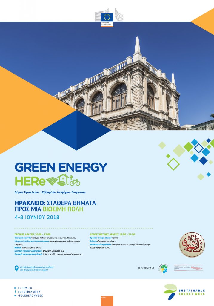 Οι εκδηλώσεις της Εβδομάδας Αειφόρου Ενέργειας συνεχίζονται καθημερινά έως και την Παρασκευή 8 Ιουνίου με την ενημέρωση του κοινού, τη συλλογή χρησιμοποιημένων λαμπτήρων, τη μέτρηση του οικολογικού αποτυπώματος, την προβολή σε πραγματικό χρόνο των εκπομπών διοξειδίου του άνθρακα, την έκθεση ανακυκλωμένης τέχνης, την προώθηση συνεργασιών στον τομέα εξοικονόμησης ενέργειας από το ενεργειακό cluster Κρήτης, την έκθεση ηλεκτρικού ποδήλατου και ηλεκτρικού αυτοκίνητου και τη διανομή αναμνηστικών ειδών με θέμα την Εβδομάδα Ενέργειας..