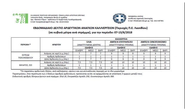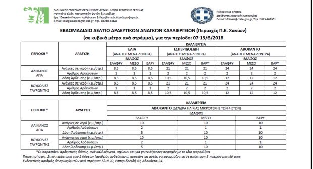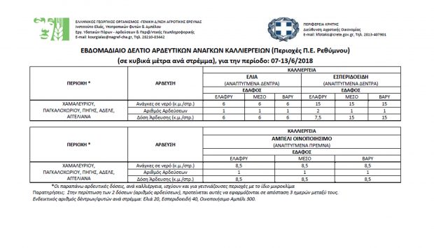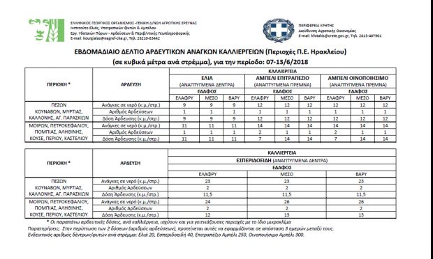 Ανακοίνωση εξέδωσε η Διεύθυνση Αγροτικής Οικονομίας της Περιφέρειας Κρήτης, μέσω της οποίας παρουσιάζει τα αρδευτικά δελτία και των τεσσάρων νομών της Κρήτης για την εβδομάδα από 7 – 13 Ιουνίου 2018.