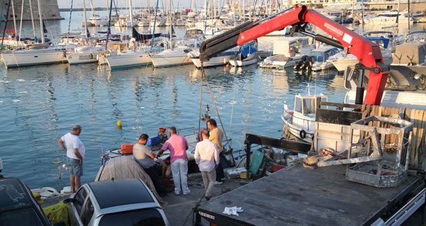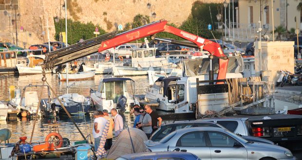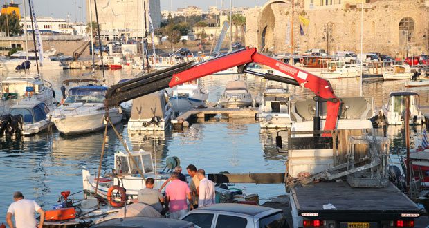 Πραγματοποιήθηκε απάντληση των υδάτων και το σκάφος ανελκύστηκε με ασφάλεια στον προβλήτα.