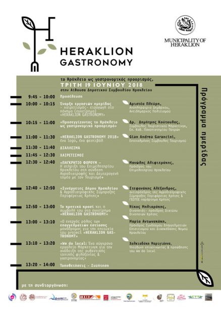 Ημερίδα με θέμα «Heraklion Gastronomy – Το Ηράκλειο ως γαστρονομικός προορισμός» θα πραγματοποιηθεί την Τρίτη 19 Ιουνίου στην αίθουσα «Ελευθέριος Βενιζέλος» στη Λότζια. Η ημερίδα θα ξεκινήσει στις 10:00 το πρωί και την διοργανώνουν η Αντιδημαρχία Πολιτισμού και Εθελοντισμού και ο Εντεταλμένος Σύμβουλος Τουρισμού με την συνδιοργάνωση του Πανεπιστημίου Κρήτης, ΤΕΙ Κρήτης, Επιμελητηρίου Ηρακλείου, Οργανισμού Λιμένος Ηρακλείου, Λέσχης Αρχιμαγείρων Κρήτης, Σωματείου Μαγείρων Ν. Ηρακλείου, Συνδέσμου Τουριστικών Πρακτόρων, Σωματείου Επαγγελματιών Ξεναγών Κρήτης – Σαντορίνης, Ένωσης Επιχειρηματιών Ενοικιαζόμενων Διαμερισμάτων & Δωματίων Ν. Ηρακλείου, Συνδέσμου Επαγγελματιών Επισιτισμού και Διασκέδασης Ν. Ηρακλείου.