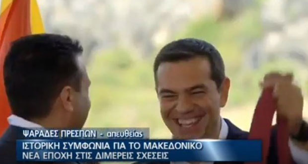 Με μια συμβολική κίνηση του Ζόραν Ζάεφ προς τον Αλέξη Τσίπρα ολοκληρώθηκε η τελετή υπογραφής της συμφωνίας για το ονοματολογικό της πΓΔΜ.