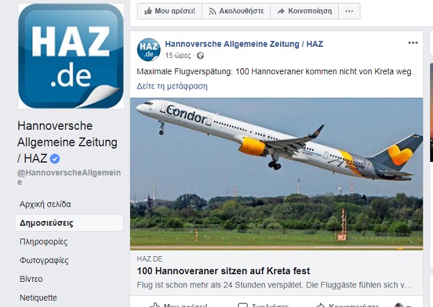 Όπως μεταδίδει η Hannoversche Allgemeine Zeitung, η πτήση της Condor από το Ηράκλειο για το Ανόβερο, με περισσότερους από 100 επιβάτες, ήταν προγραμματισμένη για το μεσημέρι της Κυριακής, αλλά πραγματοποιήθηκε 24 ώρες αργότερα, χωρίς να δοθούν εξηγήσεις στους εξοργισμένους επιβάτες, που απειλούν με προσφυγή και στη Δικαιοσύνη, όπως γράφουν μερικοί από αυτούς στα social media.