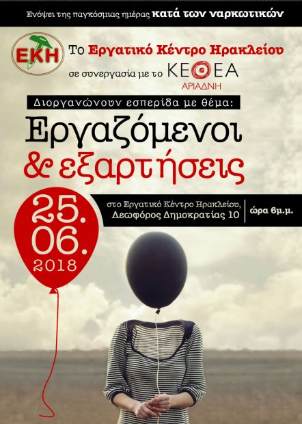 Εσπερίδα με θέμα: «Εργαζόμενοι και εξαρτήσεις» . Η εσπερίδα θα πραγματοποιηθεί με τη συνεργασία και υποστήριξη του Εργατικού Κέντρου Ηρακλείου στις εγκαταστάσεις του ΕΚΗ (Λ. Δημοκρατίας 10) στις 18:00.