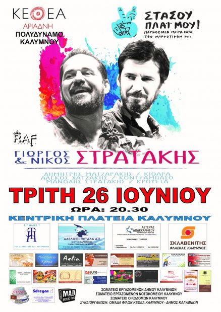 Συναυλία στην κεντρική Πλατεία Καλύμνου με το κρητικό συγκρότημα «Στρατάκια» στις 20:30. Η είσοδος θα είναι ελεύθερη. Την εκδήλωση συνδιοργανώνουν ο Σύλλογος Φίλων ΚΕΘΕΑ Καλύμνου και ο Δήμος Καλυμνίων.