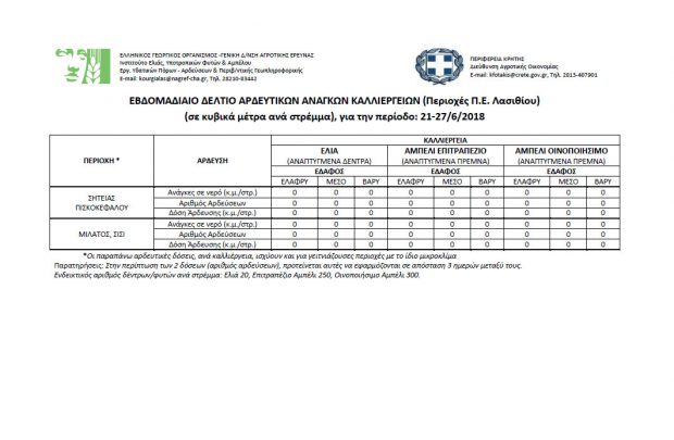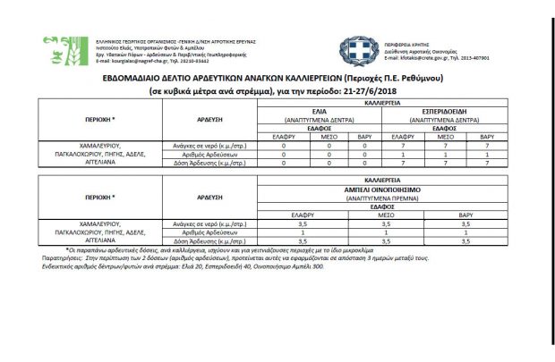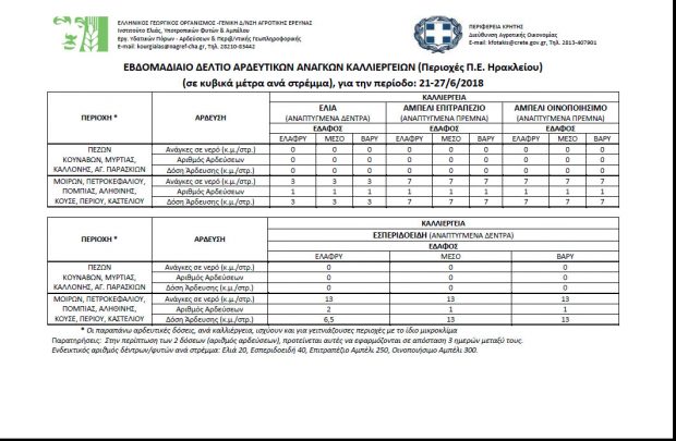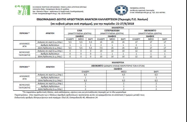 Ανακοίνωση εξέδωσε η Διεύθυνση Αγροτικής Οικονομίας της Περιφέρειας Κρήτης, μέσω της οποίας παρουσιάζει τα αρδευτικά δελτία και των τεσσάρων νομών της Κρήτης για την εβδομάδα από 21/06 έως 27/06/2018.