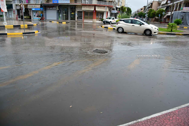 Στο Ναύπλιο η ισχυρή βροχόπτωση πλημμύρισε δρόμους και αυλές σπιτιών σε αρκετές περιοχές.
