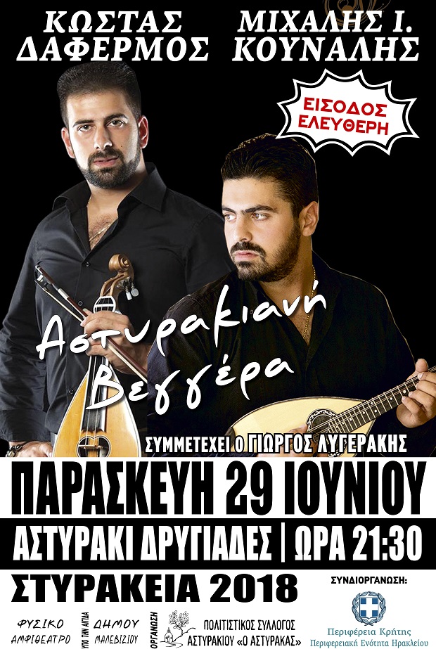 Με την συνδιοργάνωση της Περιφερειακής Ενότητας Ηρακλείου θα πραγματοποιηθεί η συναυλία «Αστυρακιανή Βεγγέρα την Παρασκευή 29 Ιουνίου 2018 και ώρα 21:30, στο Αστυράκι Μαλεβιζίου στο φυσικό αμφιθέατρο «∆ρυγιάδες» με ελεύθερη είσοδο.