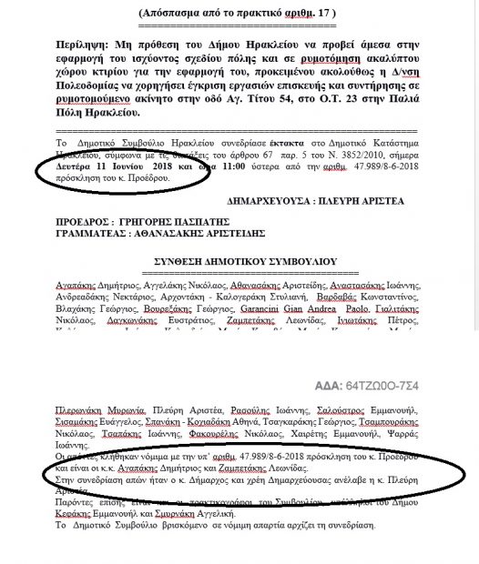 Σ’ αυτή όμως την ιστορία, στην οποία θα επανέλθουμε, υπάρχει και μια ακόμα απίστευτη λαθροχειρία, ικανή από μόνη της να οδηγήσει σε ακύρωση της απόφασης: δημοτικός παράγοντας που απουσίαζε από τη συνεδρίαση, στο επίσημο πρακτικό της απόφασης εμφανίζεται να είναι παρών και φυσικά να υπερψηφίζει την εισήγηση για τη μη ισχύ της ρυμοτομίας και την αξιοποίηση του χώρου κατά το νόμο περί προστασίας των πολιτιστικών αγαθών!