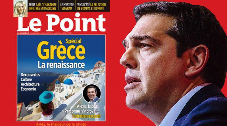 Με πρωτοσέλιδο τίτλο «Ελλάδα, η Αναγέννηση» και 32 σελίδες αφιερωμένες στην Ελλάδα, κυκλοφόρησε σήμερα το μεγάλης κυκλοφορίας περιοδικό «Λε Πουέν» ( Le Point). Επίσης, η αποκλειστική συνέντευξη του Έλληνα πρωθυπουργού προβάλλεται στο πρωτοσέλιδο με υπότιτλο «Αλέξης Τσίπρας: κανείς δεν το πίστευε».