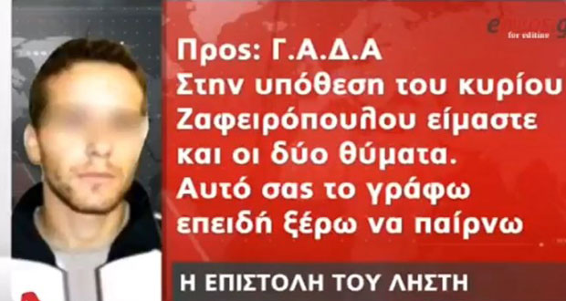 “Στην υπόθεση Ζαφειρόπουλου είμαστε και οι δύο θύματα. Ναι κάνω ληστείες αλλά δεν είμαι εκτελεστής” ανέφερε μεταξύ άλλων ο κακοποιός που υπέγραψε ως “Φτερωτός Μαραντόνα”.