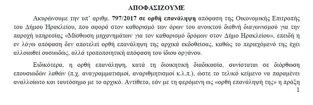 “Ακυρώνουμε την υπ’ αριθμ. 797/2017 σε ορθή επανάληψη απόφαση της Οικονομικής Επιτροπής