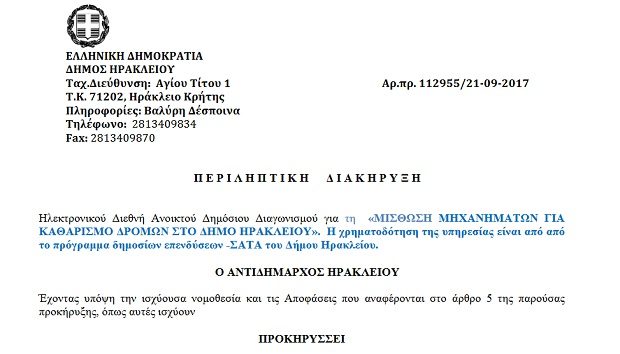 παροχή υπηρεσίας «Μίσθωση μηχανημάτων για τον καθαρισμό δρόμων στον Δήμο Ηρακλείου», επειδή η