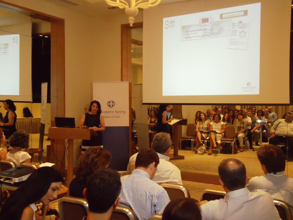 H Ελένη Χατζηγιάννη, Διευθύντρια Περιβάλλοντος και Χωρικού Σχεδιασμού της Περιφέρειας Κρήτης και Συντονίστρια του έργου SCREEN, παρουσίασε τις δράσεις και συνέργειες της Περιφέρειας Κρήτης για την Κυκλική Οικονομία, με έμφαση στον αγροδιατροφικό τομέα στην Κρήτη, απ όπου έχει ξεκινήσει η διαβούλευση με τους κλάδους των Οινοποιών και Τυροκόμων. Παρουσίασε τις ενέργειες στις οποίες έχει προβεί η Περιφέρεια Κρήτης, σε συνεργασία με τις Μικρομεσαίες επιχειρήσεις των κλάδων στην Κρήτη προκειμένου να κατανοήσουν την ανάγκη εφαρμογής πρακτικών Κυκλικής Οικονομίας, για την ανάπτυξη αλυσίδας αξίας στην γραμμή παραγωγής, την ελαχιστοποίηση του περιβαλλοντικού τους «αποτυπώματος», και την οικονομική τους ανάπτυξη. Αναφέρθηκε επίσης στις συνεργασίες της Περιφέρειας Κρήτης με άλλες Ευρωπαϊκές Περιφέρειες, καθώς και στην πρόθεση της Περιφέρειας να επεκτείνει τη δραστηριότητα αυτή στα ελαιουργεία, καθώς και στον τουριστικό τομέα, ως προς την εφαρμογή της Κυκλικής Οικονομίας στις ξενοδοχειακές μονάδες στο νησί.