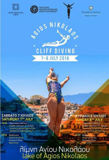 Για τρίτη συνεχόμενη χρονιά ο Δήμος Αγίου Νικολάου, η Περιφέρεια Κρήτης και η Παγκόσμια Ομοσπονδία Καταδύσεων από Υψηλά σημεία (WHDF), διοργανώνουν το «Agios Nikolaos Cliff Diving 2018» στη λίμνη του Αγίου Νικολάου.
