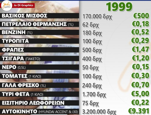 Το 1999 ο βασικός μισθός ήταν 170.000 δρχ., δηλαδή 498 ευρώ και 90 λεπτά. Σήμερα, ο κατώτατος καθαρός μισθός ανέρχεται στα 495,25 ευρώ για για νεοπροσλαμβανόμενο υπάλληλο άνω των 25 ετών που σε δραχμές είναι περίπου 168 χιλιάδες.