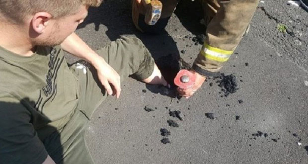 Ένας άνδρας χρειάστηκε τη βοήθεια πυροσβεστών για να απεγκλωβίσει το πόδι του από την άσφαλτο.