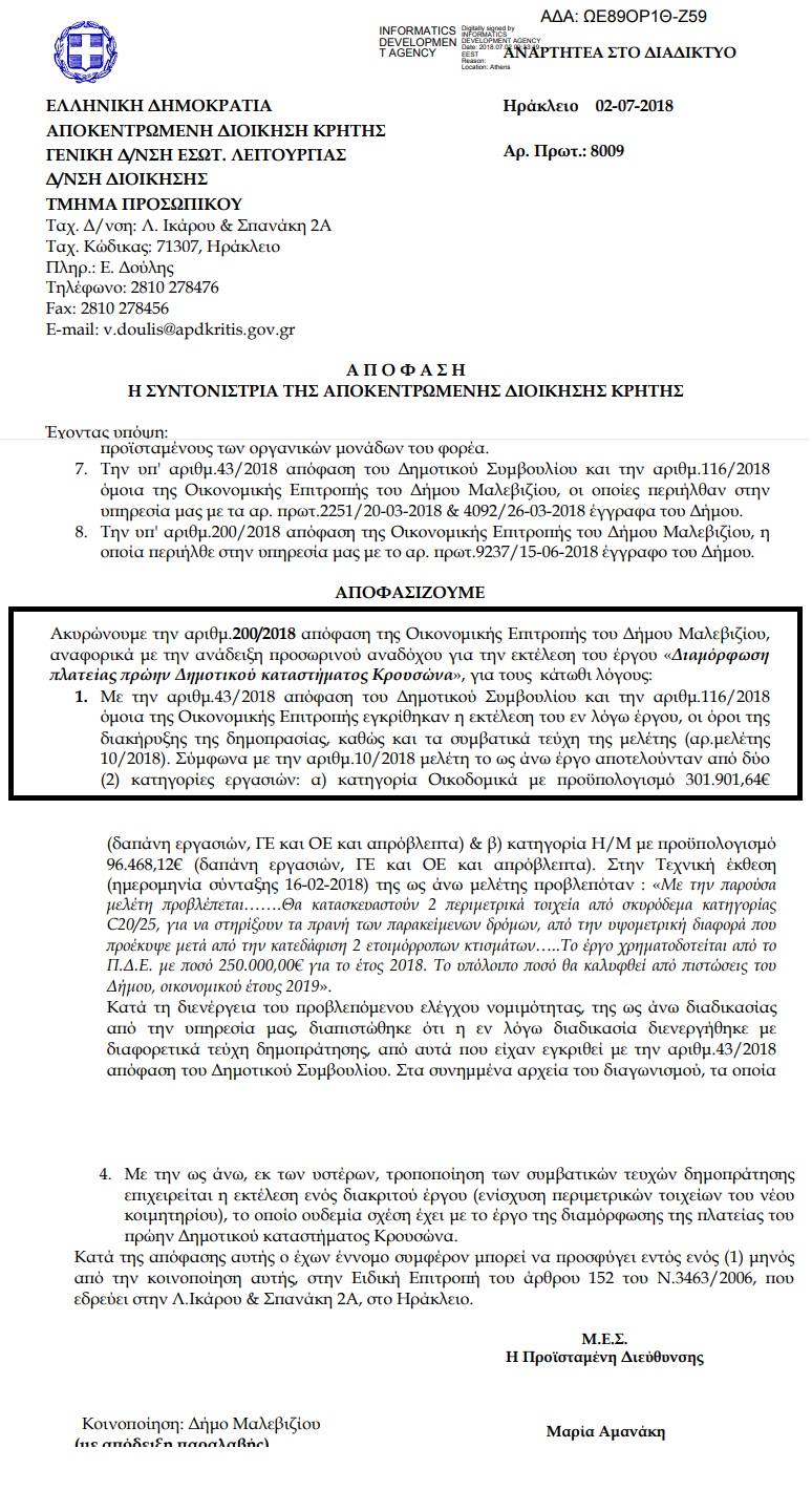 Στην πρώτη περίπτωση, ακυρώνουμε η με αριθμό 200/2018 απόφαση της Οικονομικής Επιτροπής του Δήμου Μαλεβιζίου, αναφορικά με την ανάδειξη προσωρινού αναδόχου για την εκτέλεση του έργου «Διαμόρφωση